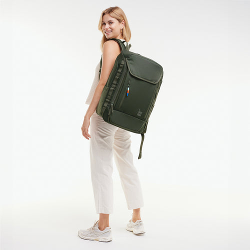 Ready for any adventure – with thoughtful design, integrated shoe compartment, extra packing cube, and 35L volume. Made with recycled Ocean Impact Plastic.