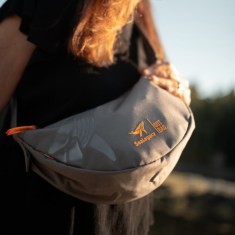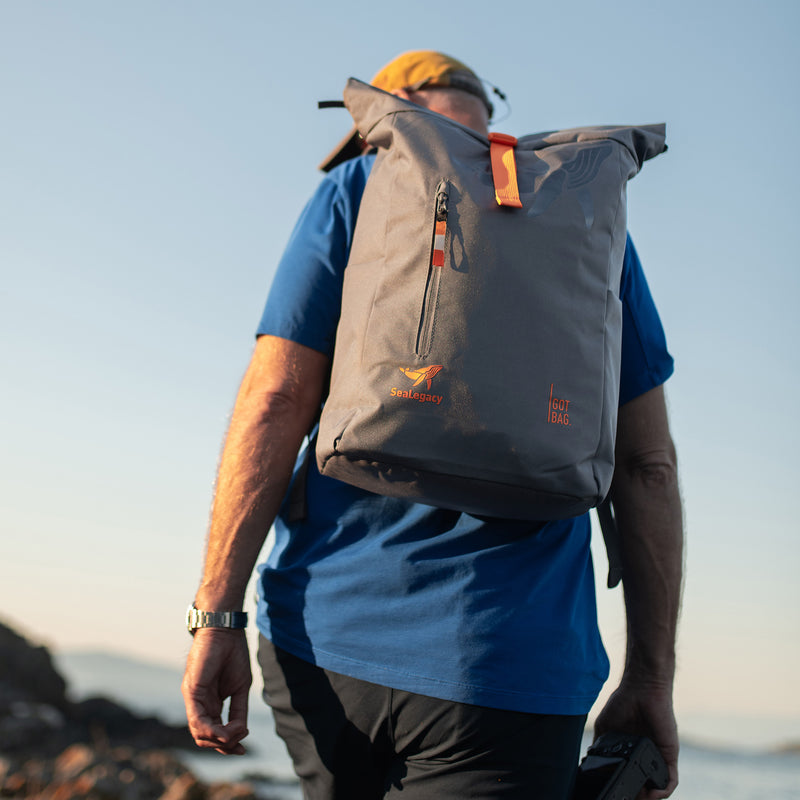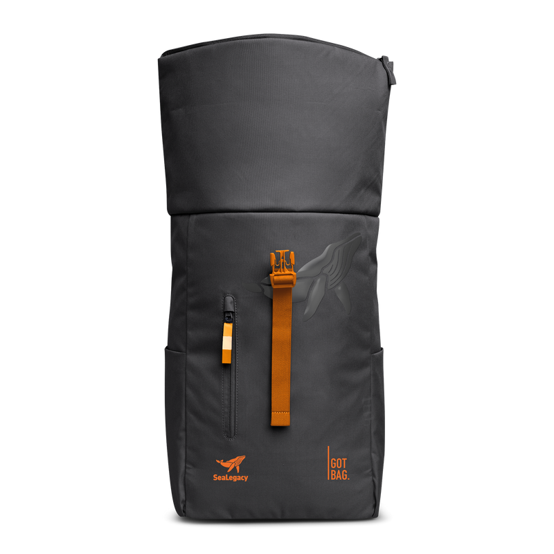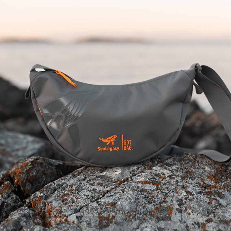 Das Hauptmaterial der SeaLegacy Kollektion besteht aus recyceltem Plastikmüll aus küstennahen Gebieten und dem Meer. Die Collab Edition umfasst unseren Rucksack ROLLTOP EASY sowie die beliebte MOON BAG SMALL – beide in shark/orange mit dem ikonischen SeaLegacy-Logo.